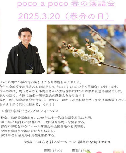 いつの間にか梅の花が咲きほころぶ時期となりました。今年も金原亭小馬生さんをお招きして「poco a poco 春の落語会」を行います。